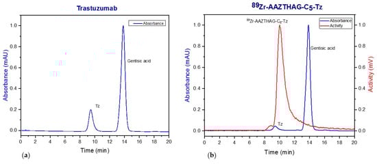 HPLC-SEC chromatogram of (a) Trastuzumab; (b) 89Zr-AAZTHAG-C5-Tz. UV–Vis: tr = 9.40 min; activity: tr = 10.00 min, the peak with tr = 13.38 min is due to Gentisic acid present in the formulation buffer used for the purification of the product. The radioactivity peak has the same retention time as the UV–Vis peak (the small delay between the two peaks is due to the sequential setup of the UV and radioactive detectors), proving that the antibody is conjugated to the ligand and that 89Zr is complexed by the ligand-antibody conjugate.