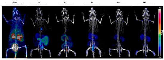 Based on the good preliminary in vitro stability results, we investigated the behavior of 89Zr-AAZTHAG in vivo in healthy female nude mice (n = 3) by acquiring PET/CT images at six different time points (30 min, 3 h, 6 h, 9 h, 12 h, and 24 h), and mice were then sacrificed 24 h p.i. to perform a biodistribution study. In Figure 4 below are reported the PET/CT images at the six time points, where a hepatobiliary and renal excretion is visible. Moreover, since a very low amount of Zr-89 has been released from the complex, a low signal in bones was visualized during the PET acquisition, indicating good stability in vivo, comparable to other compounds reported in the literature [21].