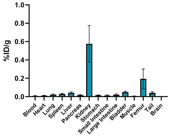 Tracer accumulation results (Figure 5 and Figure S5) show high in vivo stability of the labeled complex 89Zr-AAZTHAG, as demonstrated by the low 89Zr accumulation measured in the femur (0.193 ± 0.108% ID/g), kidneys (0.575 ± 0.199% ID/g), and other organs at 24 h p.i. These results are comparable to those reported in the literature for in vivo stability studies of desferrioxamine (DFO) and another alternative chelator for Zr-89, the so-called HOPO chelator [21]. According to the PET images, our biodistribution data confirm the fast hepatobiliary/renal excretion of the labeled ligand due to the low molecular weight (558.63 Da) [34]. Although a “naked” and negatively charged 89Zr-chelate complex does not persist in vivo long enough to encounter a challenge to its structural integrity compared to a conjugated version, nevertheless, the results obtained show a stable 89Zr-complex once conjugated with a biomolecule. As already reported above, the functionalized version of this chelator was afterwards synthesized and conjugated to Tz, as a proof of concept. No damage occurred to the structure of the monoclonal antibody Trastuzumab once conjugated and radiolabeled with 89Zr, as confirmed by SDS-PAGE + autoradiography analysis and by stability analysis in vitro over time.