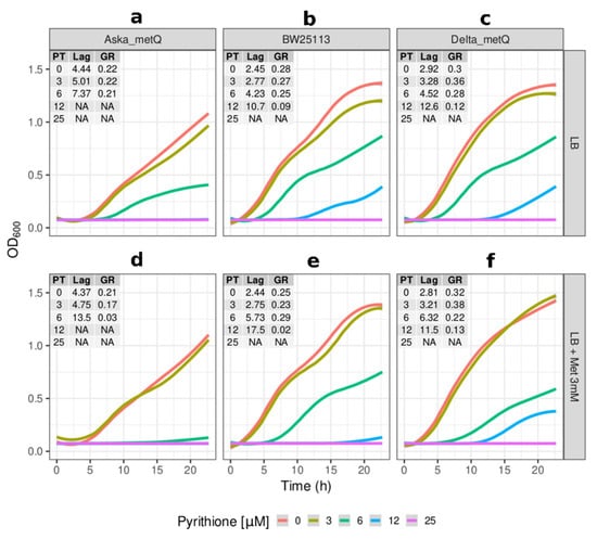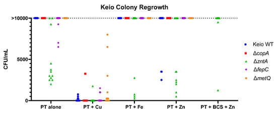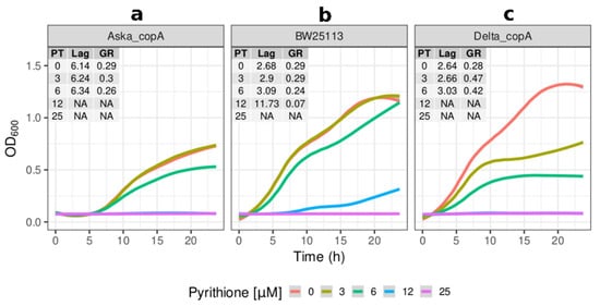 2.2. Growth Kinetics of Knockout and Overexpression Strains for metQ, fepC, copA, and zntA Genes at Variable Concentrations of Pyrithione Expanded on the Observations from the Initial Knockout Library Screening