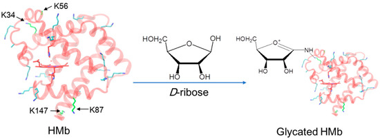 - Roy, A.; Sil, R.; Chakraborti, A.S. Non-enzymatic glycation induces structural modifications of myoglobin. Mol. Cell. Biochem. 2009, 338, 105–114. [Google Scholar] [CrossRef]