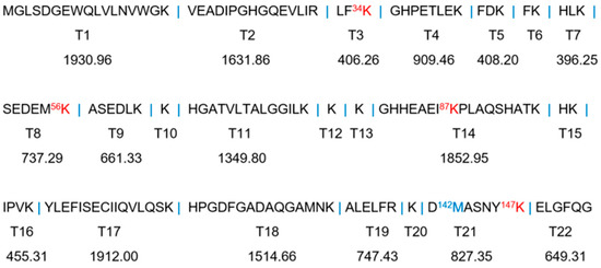 - Wang, S.-H.; Wang, T.-F.; Wu, C.-H.; Chen, S.-H. In-Depth Comparative Characterization of Hemoglobin Glycation in Normal and Diabetic Bloods by LC-MSMS. J. Am. Soc. Mass Spectrom. 2014, 25, 758–766. [Google Scholar] [CrossRef] [PubMed]