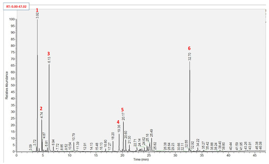 GC–MS chromatogram of ABSEO of shoots of Araucaria bidiwillii cultivated in Egypt. Main components were numbered (1–6); α-Pinene (1), Sabinene (2), d-Limonene (3), β-Humulene (4), Germacrene D (5), and Beyerene (6).