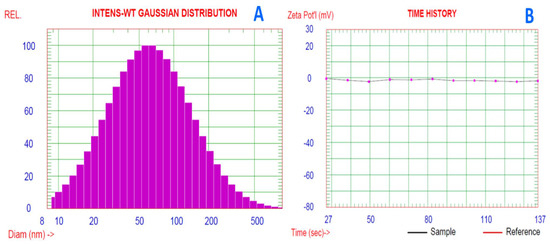Nanoemulsion of ABSEO was prepared by deionized water and a hydrophilic surfactant polysorbate 80 (Tween 80). The prepared nanoemulsion’s droplet size distribution was calculated. The mean droplet size diameter was 86.9 ± 0.846 nm, with 25% of the distribution less than 35.4 nm, 50% < 61.7 nm, 75% < 108.4 nm, 80% < 124.7 nm, while 90% of the distribution was less than 180.3 nm (Figure 2A). The zeta potential average value of the nanoemulsion was −1.84 mV (Figure 2B).