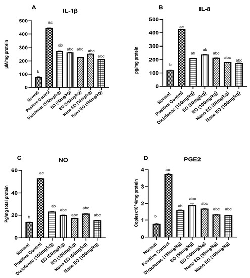 The positive control group injected with 0.1 mL carrageenan (1% w/v) significantly (p ˂ 0.05) increased IL-1β (447 ± 0.71 pg/mg protein) and IL-8 (427 ± 3.72 pg/mg protein) as compared to normal control group (79.6 ± 2.16 pg/mg protein and 120.6 ± 3.12 pg/mg protein, respectively). Oral treatment with diclofenac (Group 3) at a dose of 30 mg/kg significantly (p ˂ 0.05) decreased the induced IL-1β (276 ± 2.7 pg/mL protein) and IL-8 (213 ± 1.7 pg/mL protein). Oral treatment (Groups 4–7) with ABSEO (50–100 mg/kg) and ABSEO nanoemulsion (50–100 mg/kg), respectively, significantly decreased the elevated IL-1β (265 ± 4.21, 230 ± 2.75, 255 ± 2.75, and 214 ± 2.35 pg/mg protein, respectively (Figure 3A)) as well as IL-8 (240 ± 1.78, 215 ± 2.01, 182 ± 3.84, and 176.6 ± 2.55 pg/mg protein, respectively (Figure 3B)), as compared to the positive control group.