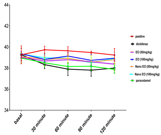 Forty-two rats were divided into seven groups (n = 6). Rectal temperature was recorded using a digital thermometer before yeast injection. Each animal was then injected intramuscularly with a pyrogenic dose of Brewer’s yeast (1 mL/100 g bwt of 44% yeast suspension in saline) [31]. The temperature was then measured 24 h following the yeast injection, and this was considered the baseline of elevated body temperature, to which the antipyretic effect will be compared. Rats that expressed a >0.3 °C increase in rectal temperature were considered pyretic and selected to complete the experiment. A single oral administration of the two doses of the ABSEO (50 and 100 mg/kg, respectively), its nanoemulsion (50 and 100 mg/kg, respectively), paracetamol (150 mg/kg) [32], and diclofenac (30 mg/kg) and saline (positive control) were carried out, and the rectal temperature was determined after 30, 60, and 120 min of intervention [33].