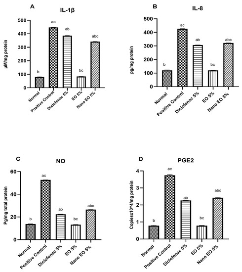 The positive control group injected with 0.1 mL carrageenan (1% w/v) showed significantly (p ˂ 0.05) increased IL-1β (437 ± 0.51 pg/mg protein) and IL-8 (411 ± 2.92 pg/mg protein) as compared to the normal control group (81.6 ± 4.16 pg/mg protein and 118.36 ± 5.12 pg/mg protein, respectively). Topical application of standard diclofenac 5% (Group 3) significantly (p ˂ 0.05) decreased the induced IL-1β (386 ± 0.51 pg/mL) and IL-8 (307 ± 12.7 pg/mL) when compared to the positive control group. Topical application of ABSEO and its nanoemulsion (5% in soyabean oil) (Groups 4 and 5) significantly decreased both the elevated IL-1β (84.6 ± 2.35 and 342 ± 1.21 pg/mg protein, respectively (Figure 5A)) and the elevated IL-8 (120 ± 8.7 and 322 ± 15.68 pg/mg protein, respectively (Figure 5B)) as compared to the positive control group. Our results showed that both ABSEO and its nanoemulsion showed a significant (p ˂ 0.05) anti-inflammatory effect as compared to standard diclofenac. In addition, it was obvious that ABSEO restored the IL-1β and IL-8 levels to normal levels (Figure 5A,B).