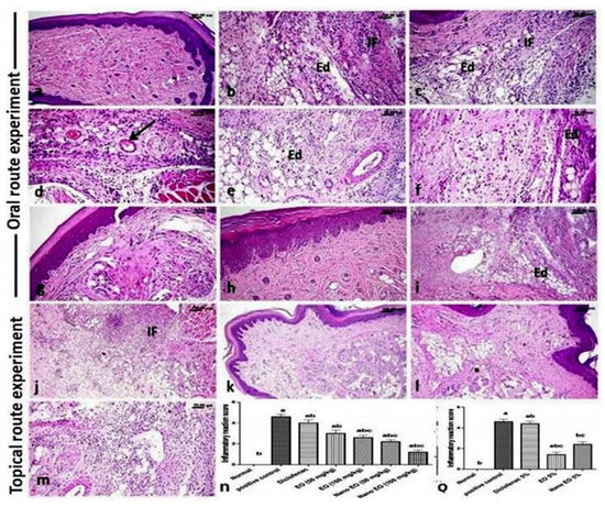 Photomicrograph of H&E-stained sections of hind paw of rats. (a) Control rat showing normal histological structure. (b–d) Carrageenan model rat showing; marked edema (Ed) and severe diffuse inflammatory cell infiltration (IF) admixed with many neutrophils, (d) vacuities with early thrombus formation (arrow). (e,f) Oral ABSEO treated carrageenan model rats at low dose (50 mg/kg) (e) and high dose (100 mg/kg) (f) showing moderate degree of decreased inflammatory reaction with still presence of edema (Ed) and infiltrated inflammatory cells (IF). (g,h) Oral ABSEO nanoemulsion treated carrageenan model rats at low dose (50 mg/kg) (g) and high dose (100 mg/kg), (h) showing a dose-related good degree of decreased to scares inflammatory reaction. (i,j) Orally (i) and topically (j) diclofenac treated carrageenan model rats showing edema and severe inflammatory reaction (IF), particularly when topically applied. (k,l) Topically applied ABSEO (5%) (k) and ABSEO nanoemulsion (5%) (l) to carrageenan model rats showing good degree of improvement of paw inflammation, particularly for the ABSEO (5%) application. (m) Topically applied soyabean showing marked inflammatory reaction. (n,o) The scores of inflammatory reactions in different treated groups compared to carrageenan model group. Scoring data are presented as median (max–min) using Kruskal–Wallis test followed by the Mann–Whitney U test. p < 0.05 was assumed to denote statistical significance. a—Significantly different from normal group at p < 0.05. b—Significantly different from positive control group at p < 0.05. c—Significantly different from diclofenac group at p < 0.05.
