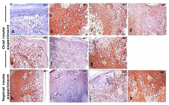 Concerning the topical route experiment, the topical application of soyabean as a vehicle positive control showed a marked inflammatory reaction (Figure 6j). While the topical application of ABSEO (5%) to carrageenan-induced inflamed paw resulted in good degree of improvement of paw inflammation, only few inflammatory cells were observed (Figure 6k). On the other hand, topical application of the ABSEO nanoemulsion (5%) showed mild improvement of the inflammatory reaction (Figure 6l), whereas topical application of diclofenac (Figure 6m) showed no evidence of inflammation subsiding. The scoring of the inflammatory reaction in carrageenan model rats and different treated groups is presented in Figure 6n,o.
