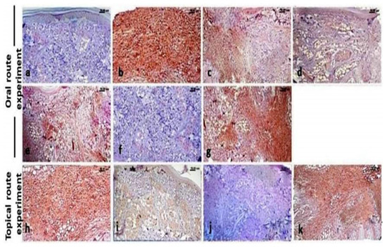 On the other hand, the topical application of soyabean showed non-significant decrease in both markers expression (Figure 7h and Figure 8h), whilst the topical treatment with the ABSEO (5%) (Figure 7i and Figure 8i) had a more curative effect than did the topical application of the ABSEO nanoemulsion (5%) (Figure 7j and Figure 8j) and showed a more significant reduction in marker expression. The topical application of diclofenac (Figure 7k and Figure 8k) showed no curative effect and did not reveal any significant decrement in both markers’ expression. Figure 9 represents the quantitative image analysis of the immune expression of each marker expressed as optical density (OD) in five different microscopic fields.