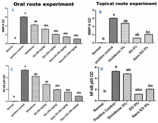 The quantitative image analysis of both MMP-9 and NF-κB p65 expression in in the oral (A,C) and topical * (B,D) experiments presented as OD of the positive brown color in five microscopic fields using image analysis software (Image J, 1.46a, NIH, USA). a—Significantly different from normal group at p < 0.05. b—Significantly different from positive control group at p < 0.05. c—Significantly different from diclofenac group at p < 0.05.