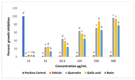 Percent growth inhibition of the Leishmania (Ds-Red L. donovani strain LV82) promastigotes caused by quercetin, gallic acid, and rutin at concentration equal to their IC50 (µg/mL) values. Data represent the mean values of three replicates with ± standard error. Different labels on columns show significant difference at p < 0.05.