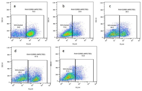 BMDMs infected with transgenic L. donovani parasites expressing the red fluorescent protein Ds-Red for the evaluation of parasitic loads using flow cytometry. Treatment was conducted with (a) untreated control and cells treated with (b) quercetin, (c) gallic acid, and (d) rutin at their inhibitory concentrations (IC50) (84.65 µg/mL, 86 µg/mL, and 98 µg/mL, respectively) for 72 h. (e) SSG 250 µg/mL was used as a positive control.