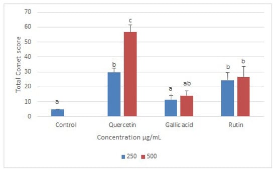 Total comet scores of leishmanial DNA damage following treatment with quercetin, gallic acid, and rutin, compared with control DNA (from untreated Leishmania). Data represent the mean values of three replicates with ± standard error. Different labels on columns show significant difference at p < 0.05.