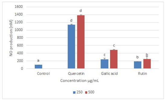 It is an established phenomenon that DNA damage can produce reactive oxygen species (ROS), which can consequently cause oxidative outburst in cells [29,30]. Conversely, high levels of ROS can lead to impaired physiological function through cellular damage of DNA, proteins, lipids, and other macromolecules, which can lead to various human pathologies including cancers, neurodegenerative disorders, and cardiovascular disease, as well as aging [31]. Furthermore, an elevated level of NO production is closely related to a high level of oxidative stress, which in turn leads to apoptosis-related cell death [32]. In many studies, leishmanial cell death has been related to the upregulation of NO [33]. In this investigation, a Griess reagent assay was conducted to measure the nitrite (end-product of cellular NO) produced after the treatment of leishmanial cells with Q, GA, and R. The supernatants of Leishmania-infected BMDMs treated with quercetin, gallic acid, and rutin showed significantly higher levels of nitric oxide production compared with untreated cells, with the Q-treated group producing the highest amount of NO, followed by GA and R at 500 µg/mL (Figure 9).