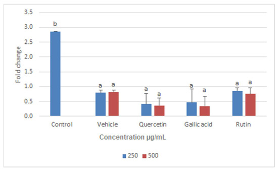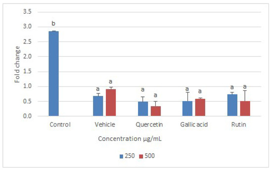 Fold change in expression level of trypanothione reductase enzyme in Leishmania donovani after treatment with two different concentrations (250 µg/mL and 500 µg/mL) of quercetin, gallic acid, and rutin. Data represent the mean values of three replicates with ± standard error. Different labels on columns show significant difference at p < 0.05.