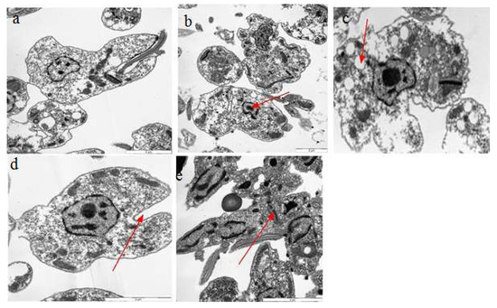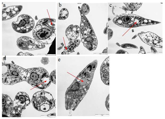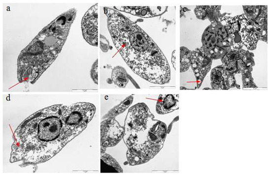 Ultrastructural changes in L. donovani LV82 promastigotes treated with gallic acid at 500 μg/mL for 72 h. (a) Distortion of the flagellar pocket, (b) acidocalcisomes, (c,d) large number of vacuoles, and (e) lipid reservoirs.