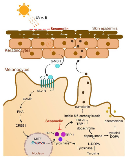 The anti-tyrosinase activity of sesamolin was also reported by Michaildish based on the inhibition of mushroom tyrosinase activity in vitro. The results showed that sesamolin exerted moderate anti-tyrosinase activity at 500 μΜ and weak activity at 100 and 25 μΜ [32]. Sesamolin also showed high antimelanogenesis activity in skin cancer cells (B16F10). This study evidenced that sesamolin inhibited the expression of melanogenesis-related mRNA levels, as well as proteins such as tyrosinase and TRP-1 and TRP-2 at a concentration of 50 μΜ [55]. Figure 3 shows the summary of the mechanism of sesamolin inhibition of melanin production.