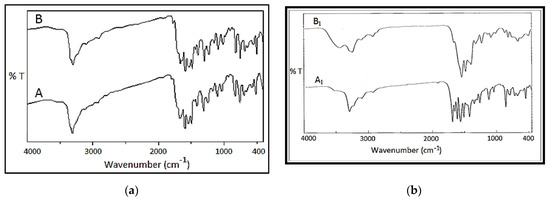 The FT-IR spectra of ligand H2L(B, A) and Pb(II), Mn(II), Hg(II) and Zn(II) complexes before and after γ-irradiation (B1–B4 and A1–A4) are reported in Table 2, Figure 1, and Figure S1a–c. The FT-IR spectrum of the ligand before irradiation shows stretching frequencies of ν(N4), ν(N2), ν(N1), ν(C=O), and ν(C=S) at 3335, 3302, 3100, 1670, and 750 cm−1, respectively. After γ-irradiation, the corresponding bands ν(N4), ν(N2), ν(N1), and ν(C=S) were shifted to higher wave numbers as compared to the free ligand. At the same time, the functional group of ν(C=O) shifted to a lower wave number after γ-irradiation [30].