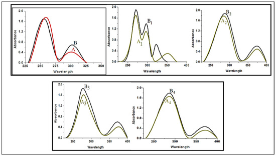 The electronic spectral bands of the ligand and Pb(II), Mn(II), Hg(II), and Zn(II) complexes before (B, B1, B2, B3, and B4) and after (A, A1, A2, A3, and A4) γ-irradiation (λmax, nm) in DMF solution in the range of 200–800 nm at room temperature are listed in Table 3 and Figure 2. UV spectra of the ligand (B and A) were perceived as the existence of two absorption bands at 260, 300, and 266, 303 nm before and after γ-irradiation, respectively, assigned to the π–π* transition. While, the UV-visible spectra of the Mn(II) complexes (B2 and A2) before and after irradiation exhibited bands at 294, 292, 378, and 376 nm, respectively. The Zn(II) complexes (B4 and A4) before and after irradiation also displayed bands at 291, 294, 375, and 378 nm, which may be assigned to n-π* transitions, representing a square planar geometry [31,32]. The electronic spectra of the Hg(II) complexes before and after irradiation (B3 and A3) resulted in bands at 276, 281, 372, and 376 nm [33,34]. On the other side, the electronic spectra of the Pb(II) complexes (B1 and A1) show three-bands at 270, 300, 320, and 354 nm assigned to n-π* transitions in an octahedral geometry around the Pb(II) ion, which is further confirmed by its diamagnetic nature [35,36]. The complexes showed no d-d band; the complexes contained only paired electrons and were diamagnetic.