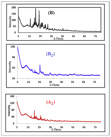 For the irradiation studies, the solid samples of prepared compounds (B, B1, B2, B3, and B4) were subjected to a 60 kGy γ-irradiation dose with a rate equal to 2.2 kGy h−1 [24]. The test was performed using the Indian 60Co γ-ray cell type GE-4000 A at room temperature (at the Egyptian Atomic Energy Authority (EAEA), Nasr City, Egypt). After removing the samples from the radiation field, the FT-IR, absorption spectra, thermal analysis (TG/DTG), anti-bacterial, and anti-cancer activities of the irradiated samples were investigated. X-ray powder diffraction analyses of the un-irradiated (B, B2, and B4) and irradiated (A2 and A4) samples of the synthesized compounds were conducted using a Rigku Model ROTAFLEX Ru-200 at the National Research Centre, Dokki, Cairo, Egypt. The divergence and receiving slits values were 1 and 0.1, respectively.