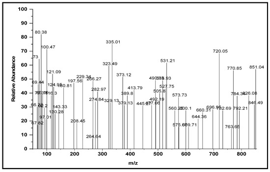 The mass spectra were mainly performed to confirm the composition and support the structure of the synthesized chelates. The molecular ion peaks for the Hg(II) complex were examined at m/z = 849.1 (Table 1 and Figure 4), which suggests the stoichiometry of the metal and ligand in metal chelates as a 2:1 ratio. The observed data of the complexes are in agreement with their formula as designated from the microanalytical data.