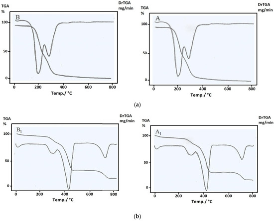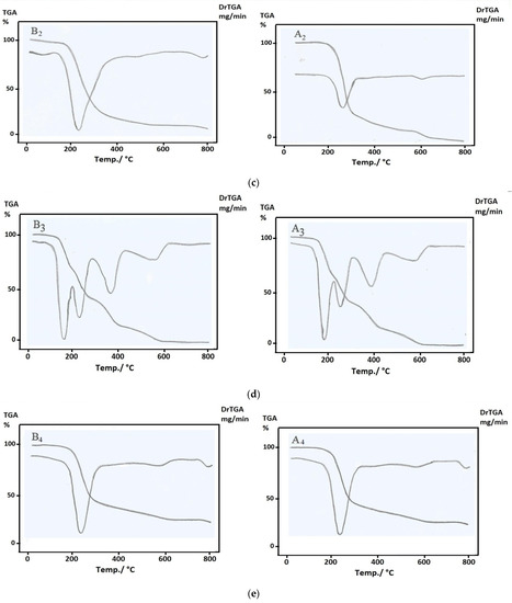 The thermal behavior of the ligand (B, A) and Pb(II) (B1, A1), Mn(II) (B2, A2), Hg(II) (B3, A3), and Zn(II) (B4, A4) complexes before and after γ-irradiation are listed in Table 5 and Figure 5a–e. The TG curves of B and A in Figure 5a revealed thermal stability till 190 °C and 240 °C, and also showed two decomposition steps in a temperature range of 190–633 °C and 240–680 °C, with the total weight loss of calc. 99.9% (found 100%) and calc. 100% (found 100%) before and after γ-irradiation, respectively. After irradiation, the thermogravimetric analyses (TG) curves of the ligand revealed that γ-irradiation stimulated more thermal stability of the substance than those that were un-irradiated. These results are consistent with the structure of the ligand resolute as determined by the elemental analysis and IR spectroscopy.