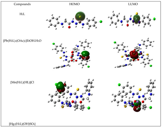 Frontier HOMO and LUMO molecular orbitals for the ligand H2L and Pb(II), Mn(II), Hg(II), and Zn(II) complexes, calculated at DFT level.