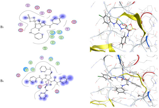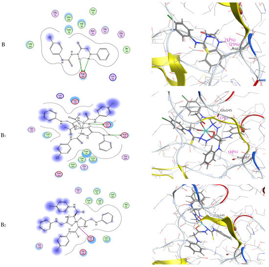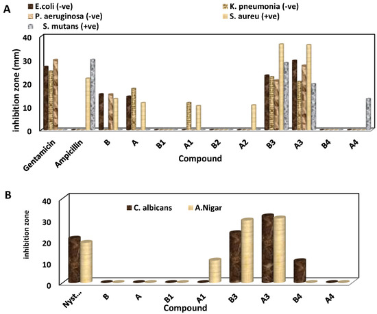 The thiosemicarbazide ligand and chelate compounds before and after irradiation had varying degrees of inhibitory effect on the growth of Gram-negative bacteria, such as Escherichia coli, Klebsiella pneumonia, and Pseudomonas aeruginosa, Gram-positive bacteria (Staphylococcus aureus and Streptococcus mutans), and fungi (Candida albicans and Asperagillus Nigar); the inhibitory effect results are presented in Table S6 and Figure 7. Furthermore, C. albicans was affected by complex (B3, B4) before irradiation, with inhibition ranges of 10.3 ± 0.5 and 23.6 ± 0.6, respectively. In turn, complex (A3) after irradiation showed higher activity, with an inhibition range of 31.6 ± 0.6. A. nigar was affected by complex (B3) before irradiation, with an inhibition range of 29.3 ± 0.6, and the higher activity was for complex (A3) after irradiation, with an inhibition range of 30.6 ± 0.6; this is compared with the positive control drug used for both fungi. The in vitro antimicrobial activity exhibited by the synthesized compounds before and after irradiation is in Table S6. The results showed that complex (B3) before irradiation towards Gram-negative bacteria (E. coli, K. pneumonia, and P. aeruginosa) had higher activity than other complexes, with an inhibition range of 23.3 ± 0.6, 22.6 ± 0.6, and 21.3 ± 0.6, respectively. The complex (A3) after irradiation had the highest activity, with an inhibition range of 29.6 ± 0.6, 20.6 ± 0.6, and 27.6 ± 0.6, respectively, compared with other complexes before and after irradiation. In addition, the results reported that complex (A3) after irradiation had the highest activity with an inhibition range of 33.3 ± 0.6 and 19.6 ± 0.6, while complex (B3) before irradiation towards Gram-positive bacteria (S. aureus and S. mutans) had higher activity than other complexes, with an inhibition range of 36.6 ± 0.6 and 28.6 ± 0.6, respectively. Therefore, the [Hg2(H2L)(OH)SO4] complex after irradiation had a higher activity than other complexes. These results can be demonstrated according to the basis of Overtone’s concept and Tweedy’s chelation theory [38,39,40,41], as the chelation increases the delocalization of p-electrons over the whole ring. Hence, this enhances the compounds’ penetration into lipid membranes. In addition, the oxidation state of the metal ion, type, and number of donor sites besides their relative presence within the ligand, solubility, conductivity, particle size, and bond length between the metal and ligand are also important in determining the antimicrobial activity of compounds [42,43].