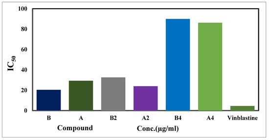 Vinblastine (4.58) > B (20.45) > A2 (23.95) > A (29.45) > B2(32.6) > A4 (86.24) > B4 (189.96) µg/mL. These obtained results concluded that the synthesized ligand and its complexes have a good anticancer effect on the HepG2 cell line, except the Zn(II) complex before irradiation (B4) and Mn(II) complex after irradiation (A2), which are the most active ones. Moreover, vinblastine had an enhanced anticancer effect on the selected cancer cell lines.