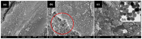 Images of FE-SEM of sugarcane bagasse (a) before treatment (SB), (b) after delignification (SB-D), and (c) amine-functionalized magnetic sugarcane bagasse biocomposites (SB-MH), ((c), inset) TEM image of magnetic naoparticles.