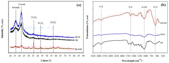 (a) X-Ray Diffraction (XRD) pattern and (b) FT-IR spectrum of sugarcane bagasse (SB), SB after delignification (SB-D) and biocomposites of amine magnetic sugarcane bagasse (SB-MH).