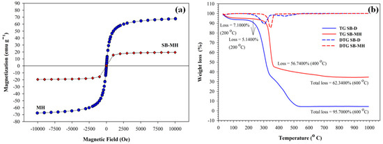 (a) Magnetization property of amine magnetic (MH) and amine magnetic sugarcane bagasse biocomposites (SB-MH) at room temperature; (b) Thermogravimetry (TG) and Derivative Thermogravimetry (DTG) curves of delignified sugar cane bagasse (SB-D) and amine magnetic sugarcane bagasse biocomposites (SB-MH).