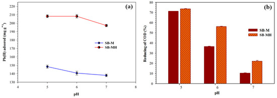 COD concentration is influenced by role of the pH solution; the adsorption phenomenon is correlated to the ion exchange process. pH adjustment of the solution influences the adsorbent surface charge, ionization degree, stability and color intensity of the compounds in solution [39]. Figure 5b shows COD reduction at various pH. The largest reduction of COD occurred at pH of 5 with a value of 71.29% and 73.63% for SB-M and SB-MH, respectively. Generally, COD value decreased with increasing pH. For higher pH, the lower adsorption occurs due to an increase in the diffusion barrier of organic ions as well as the abundance of OH- ions; this causes the competition between organic molecules and the adsorbent surface [40]. At low pH, the positively charged group of organic molecules is bound by the attraction of electrostatic forces to the negative charge of the adsorbent surface. This is in keeping with the previous studies where low pH solutions increased the COD reduction using an adsorbent made from bagasse [41].