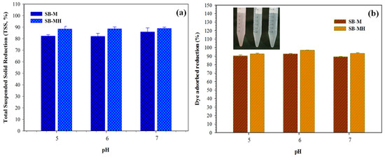 Besides having an effect on COD reduction, the adsorbent also has capability to degrade TSS. Stable suspended particles can be neutralized through a destabilization process with the addition of a positive charge from the adsorbent, afterward the energy resistance is reduced and a flock core is formed. The existence of a positive charge that is able to absorb negative charges on suspended particles surface causes the repulsion force between suspended particles in the waste to weaken. The comparison of TSS reduction in differences of pH is presented in Figure 6a, and the decrease in TSS is not very significant for all adsorbents. Another effect on SB-M and SB-MH adsorption is dye reduction (Figure 6b). The high dye reduction for SB-M and SB-MH occurred at pH 6. Dye reduction number was obtained at about 92.56% and 96.69% for SB-M and SB-MH, respectively. The reduction color for dye was observed before adsorption and after adsorption by using SB-M and SB-MH (Figure 6b, inset). It is clear that the original color (purple) disappears, becoming a clear solution after adsorption. The decrease of dye intensity in solution is probably due to protonation that would be the specific cause for the enhancement of electrostatic interaction between the negatively charged anions in the molecule of dye and the positive charge of the adsorbent active site [42].