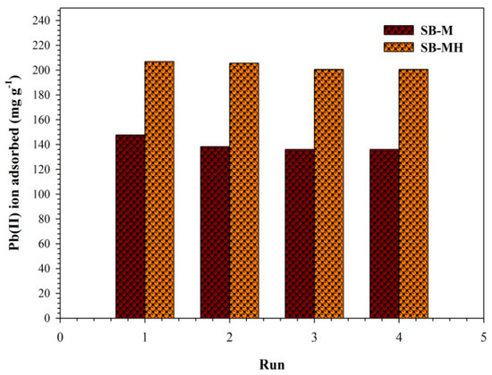 In order to evaluate the regeneration of biocomposites, 0.01 M HCl was elected as the effluent for Pb(II) ion desorption. The regeneration using 0.01 M HCl provides better desorption for the reuse process. As reported, the optimum desorption efficiency of the Pb(II) ion was obtained at value of 91% with 0.01 HCl [43]. At low pH, the hydrogen ions were combined with the ligands, then took place the adsorption site of the Pb(II) ion. Spontaneously, the Pb(II) ion will be released into solution. Desorption using HCl allows Pb(II) ions to be able to bind Cl- to form PbCl2; thus, adsorbent can be reused for the next process of adsorption. The adsorption performance of Pb(II) ions using SB-M and SB-MH was conducted in four cycles (Figure 7). The desorption efficiency for SB-M and SB-MH was about 92.11% and 96.96%, respectively. For both adsorbents of SB-M and SB-MH, the capacity of the Pb(II) ion adsorption during the reusable process decreased to be only below 10% after 4th cycles, i.e., 7.89% and 3.84%, respectively. The decreasing of adsorption capacity of adsorbents in reusability process also occurred in previous studies for biocomposites [20]. Derivation occurs due to unalterable ions of partial functional groups on the surface of biocomposites, thus affecting the subtraction in the number of sites and weakening the electrostatic interaction between the adsorbate and adsorbent [44]. A slight subtraction in the capacity of adsorption is owing to the incomplete desorption of divalent metal ions from the surface of adsorbent and also due to the reduction of some surface functional groups such as -OH and the amine group as well as the leaching of weak inorganic materials (Fe3O4) [45].