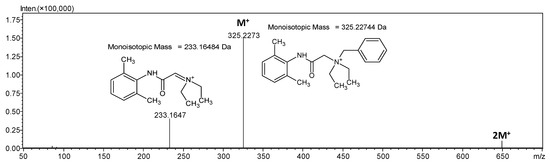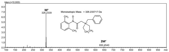 The mass spectrometrum of the denatonium benzoate in positive ion mode, as a compound containing quaternary nitrogen atom, is characterized by the signal at m/z 325.2273 which corresponds to the M+ denatonium ion (Figure 1).