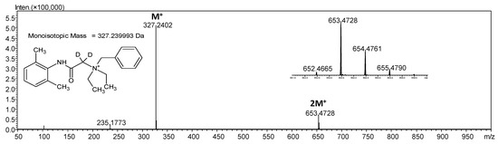 On the presented mass spectrum (Figure 3), obtained for the deuterated denatonium cation at the α carbon, the high intensity signal at m/z 327.2408 corresponds to the final product of the H/D exchange reaction. Additionally, the signal at m/z 653.4728 corresponding to the non-covalent dimer is present. If the formation of the discussed dimer in the gas phase occur due to the deprotonation at the α carbon atom within the denatonium cation the signal corresponding to such dimer should be characterized by the m/z at 652.4664 due to the loss of deuterium. The observed m/z value suggests that the neutralization results from the proton dissociation, not deuterium. There is a possibility of dissociation of benzyl hydrogen and amide hydrogen atoms. To find out which hydrogen is able to undergo dissociation we performed the ESI-MS analysis of the denatonium benzoate dissolved in D2O where only amide hydrogen atom was exchanged to deuterium. Amide hydrogen as a hydrogen connected with the heteroatom undergoes exchange with protons of the solvent within a few minutes whereas hydrogens bound to carbon atoms are not exchangeable under the applied conditions. The obtained results of the ESI-MS analysis are presented in Figure 4. Before the experiments with D2O all of the lines within the LC system were purged with D2O and the ion source was saturated with D2O for 30 min to remove the possible presence of H2O, which may cause the back exchange of the introduced deuteron at the amide nitrogen atom.