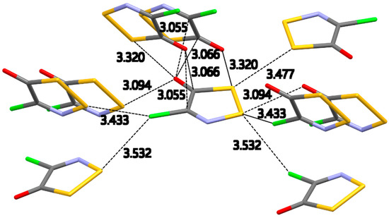 Intermolecular short contacts (Å) expanded for the central dithiazolethione 2c–α in the asymmetric unit cell.
