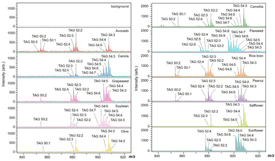 | 1 | Peanut oil and soybean oil Grapeseed oil | Abundant peak at m/z 901.6 and 903.6 Similar to soybean oil, but with an additional peak at m/z 899.6 |