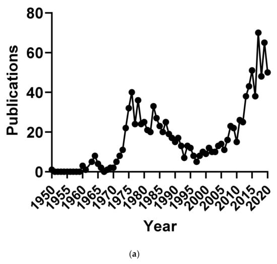 Number of publications on cordycepin by year and geographical origin. (a) Number of publications on cordycepin per year of publication 1950–2018; (b,c) Geographical distribution of the affiliation of the corresponding authors of publications on cordycepin in two periods: (b) 1950–1997 and (c) 1998–February 2021.