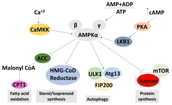 5’-adenosine monophosphate (AMP)-activated protein kinase (AMPK) is a highly conserved serine/threonine kinase. The AMPK kinase is a heterotrimeric protein complex containing a catalytic alpha subunit, an AMP-binding gamma subunit, and a scaffolding beta subunit. It is considered to be the master regulator of cellular energy homeostasis and is activated by upstream kinases, such as LKB1, CaMKKβ and Tak1 [156,157]. AMPK is allosterically regulated by the binding of AMP, or less commonly ADP, to its gamma subunit. This binding blocks the access of phosphatases and, thus, enhances the phosphorylation of Thr172 residue [158]. In the last decade, it has emerged that AMPK plays a central role in regulating a variety of metabolic and physiological processes. It is repressed in diverse medical conditions, such as overnutrition, inflammatory diseases, diabetes and cancer. Activation of AMPK also is the mechanism of action for the type II diabetes drug metformin. Therefore, activating AMPK could be a potential therapeutic target in treating these diseases [159,160,161].
