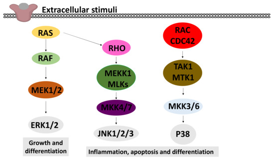 Various extracellular stimuli activate the mitogen-activated protein kinase (MAPK) cascade pathways [168]. Three distinct MAPKs have been widely investigated: p38 MAPK, c-Jun N-terminal kinases (JNK) and extracellular signal-regulated kinases (ERK), as depicted in Figure 7.