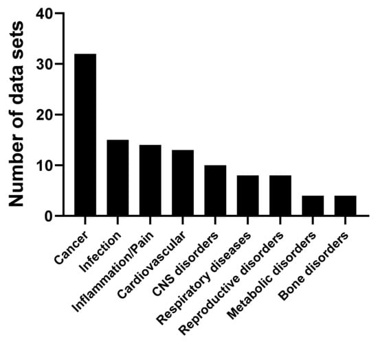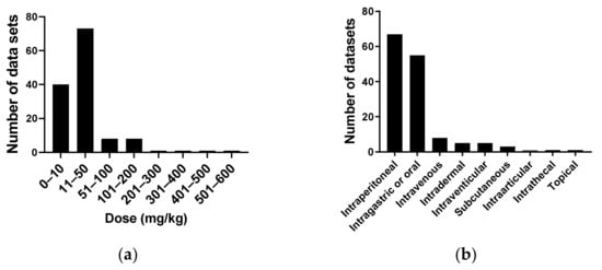 Dose of cordycepin administered to animal models in mg/kg. (a) A total of 133 studies were classified according to the range of cordycepin dose administered to the animal model; (b) The route of administration of cordycepin in 146 studies.In this systematic review, 167 articles studying the effects of purified cordycepin in a variety of animal models were found (see Table 3). We noted the details of the experimental set-up (species, model of human disease, dose in mg/kg basis and route of administration). The disease models were classified and counted (Figure 10). The majority of studies were of animal models of cancer, closely followed by cardiovascular diseases, infections and central nervous system disorders.