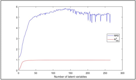 A total of 135 latent variables (LV) returned an R2adj of 0.9708 and an RPD of 5.85, which means a very good, highly explanatory model with a high prediction accuracy. Following the principle of parsimony, a minimum number of LV was searched for, that still satisfies the requirements of a well-fitting model. The minimum required RPD was set to 4.00, and for R2adj, a threshold of 0.95 was assigned, which for the former was achieved at the 26th, for the latter at the 35th latent variable with 0.9514 at which the RPD value was 4.75. Their trend is shown in Figure 5.