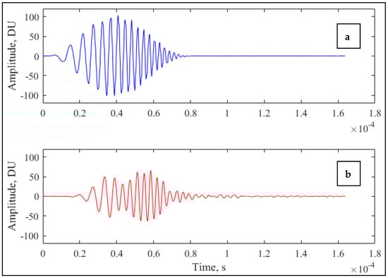 In ultrasonic measurements, a so-called “chirp” signal was utilized. This is a double-modulated test signal with increasing frequency, enveloped by a filter. In the case of the present experiment, the applied signal had a linearly increasing frequency sweep from 50 kHz to 450 kHz and was modulated by a Hanning filter [36]. Sample input and output signals (centered to zero, denoised, unnormalized) are shown in Figure 8.