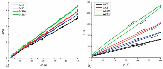 Cocoa butter represents the main part of the continuous phase in chocolate, and thus it is responsible for the dispersion of all other constituents and for the physical behavior of chocolate [21]. Rheological measurements of confectionery fat-based systems predict interactions of components within the system and behavior during processing [22]. In new product development, it is necessary to control the rheological properties of chocolate mass due to their reflection on the quality of the final product [23]. The impact of 5, 10, and 15% of RS on the rheological properties of cocoa butter and white chocolate is shown in Figure 1.
