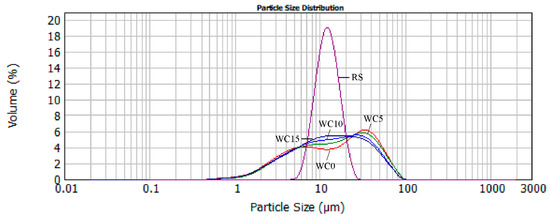 Particle size distribution influences chocolate structure–inter-particle interactions and network microstructure, rheology, and texture. Specific surface area and mean particle size influence yield stress, plastic viscosity, and hardness [26]. Figure 2 represents the particle size distribution of RS, white chocolate, and enriched white chocolate samples. The particle size distribution of white chocolate is multimodal. In general, RS has smaller particle sizes compared to white chocolate, however, it can be noticed that the largest volume of RS consists of particles with diameters in intervals of 10–20 μm, which suggests that RS is a suitable ingredient for addition in the chocolate formulation. The higher amount of added RS (from 5 to 15%) in white chocolate increased the volume of chocolate containing the particles with diameter 10–20 μm as can be seen from Figure 2.