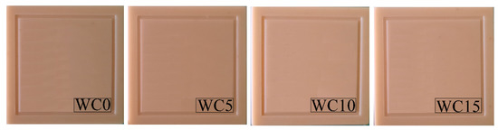 The average values of parameter ∆E were 0.49, 0.55, and 0.96 respectively. Obtained results indicate that the color difference between each sample and WC0 is very low. When the values of ∆E are between 0.2 and 0.1, it means that there is very little visibility of the color difference between samples registered by the human eye [29].