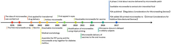 Timeline of microneedle development. The time point listed represented the important events associated with microneedles from the idea of microneedles in 1976.